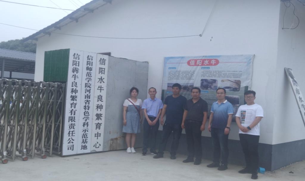 2021年6月12日,马云教授和课题组成员魏雪锋博士以及研究生前往信阳师范公司河南省特色学科示范基地——信阳水牛良种繁育中心展开调研。信阳犇牛良种繁育有限责任公司是目前该地区信阳水牛养殖规模较大,养殖设施相对较完善的良种繁育场,该场主要以信阳水牛繁育及商品牛销售为主,有效的保留了信阳水牛遗传性状,可为后续研究提供了可靠依据。马云教授就目前较为关注的信阳水牛保种、杂交扩繁和商业化利用等工作与信阳犇牛良种繁育有限责任公司郑先银总经理进行了交流和商讨,郑先银总经理表示希望可以与马云教授团队加强合作,在信阳水牛种群扩繁的基础上,开发具有当地地方特色的信阳水牛肉质产品。