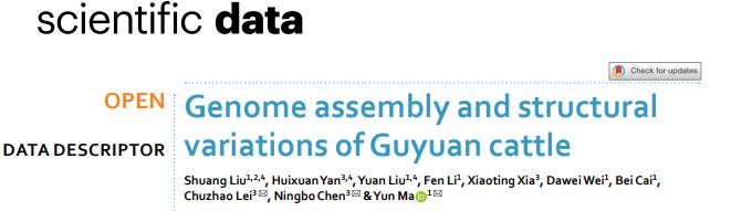 懂球体育马云教授团队联合西北农林科技大学懂球体育雷初朝教授/陈宁博副教授团队在Nature子刊《Scientific Data》(IF=6.9,5年IF=8.7)发表题为“Genome assembly and structural variations of Guyuan cattle”的研究论文。已毕业博士研究生刘爽(懂球体育/宁夏师范大学)、硕士研究生阎卉萱(西北农林科技大学)、博士研究生刘源(懂球体育)为本文共同第一作者。