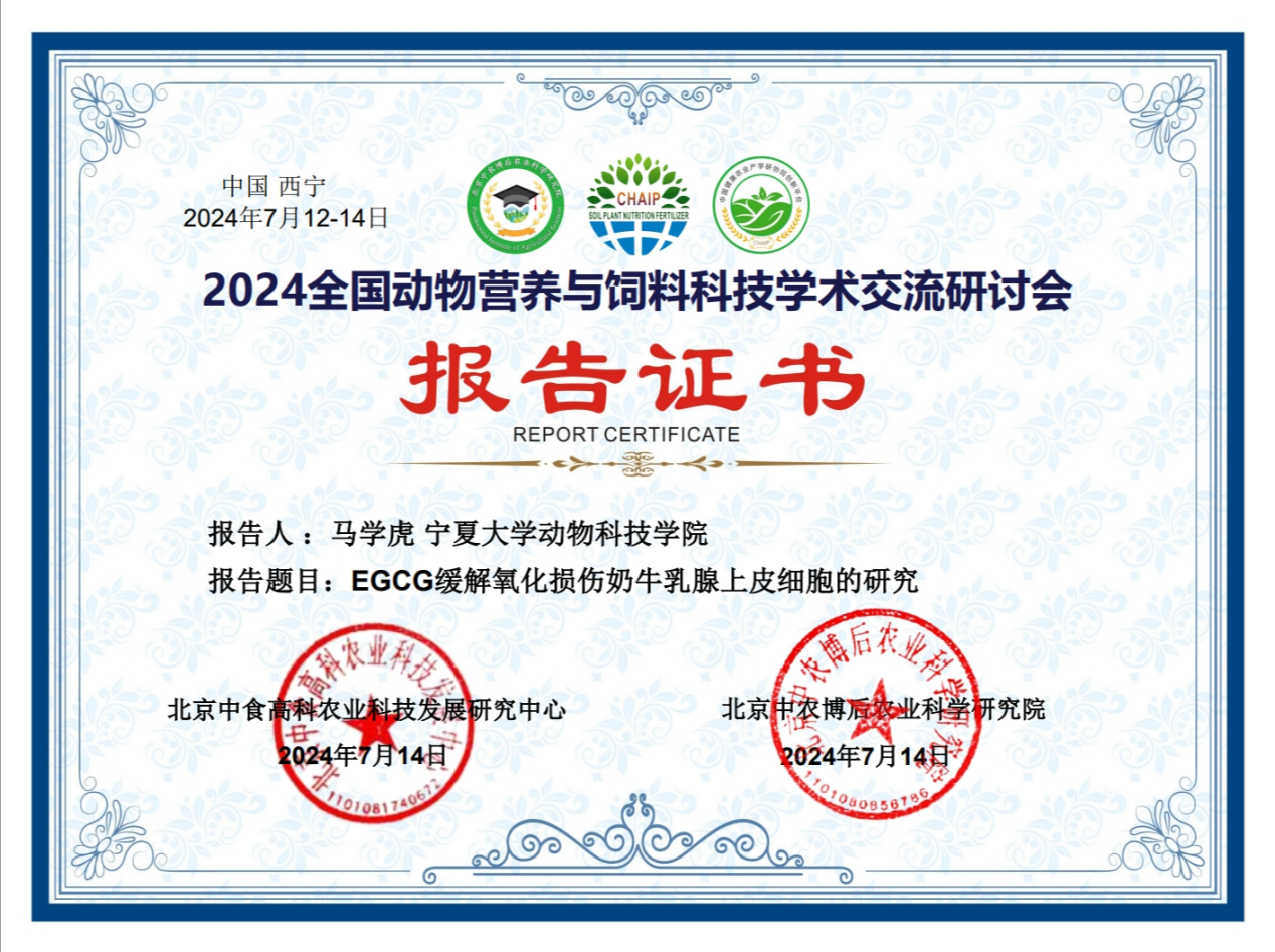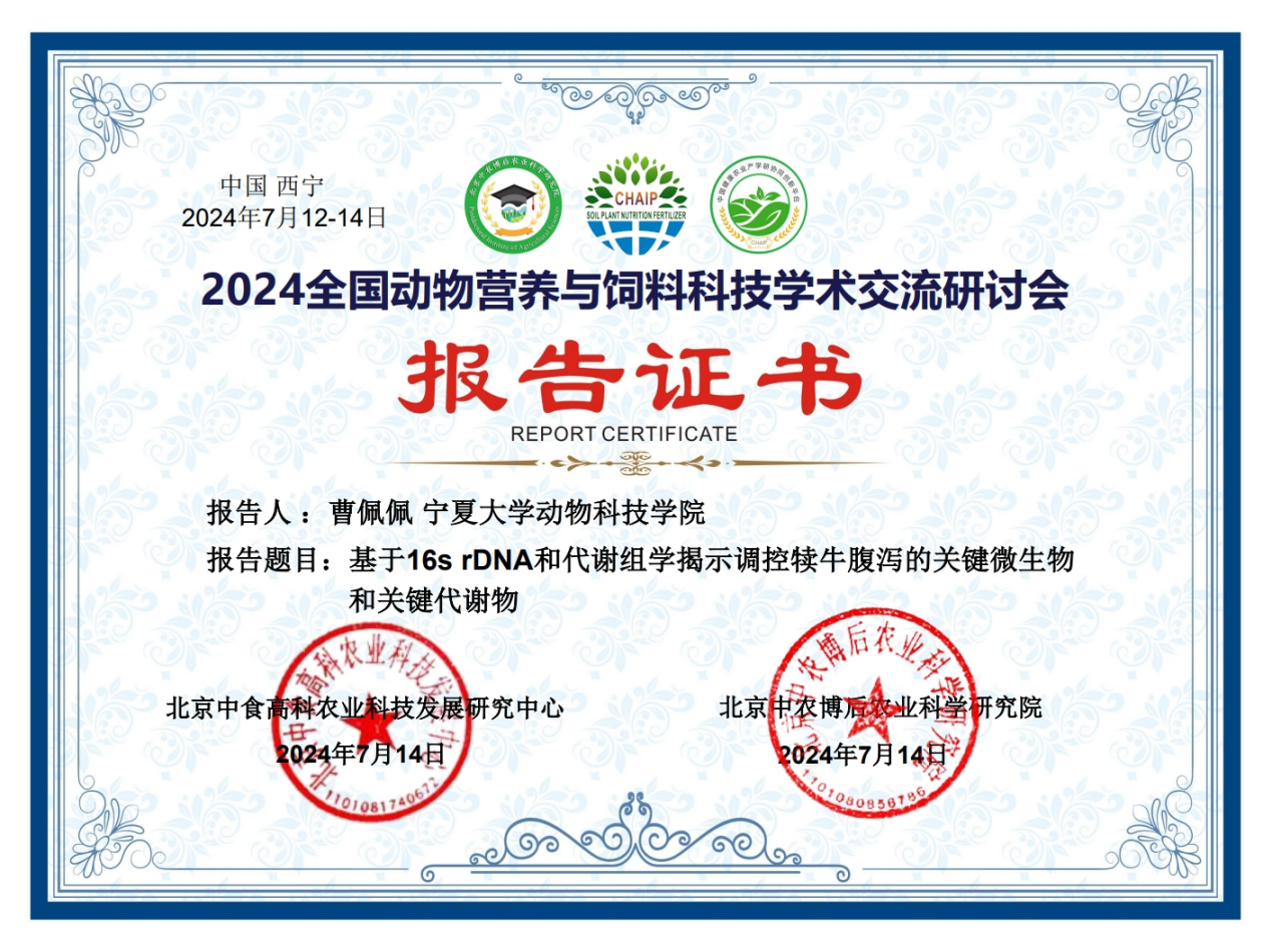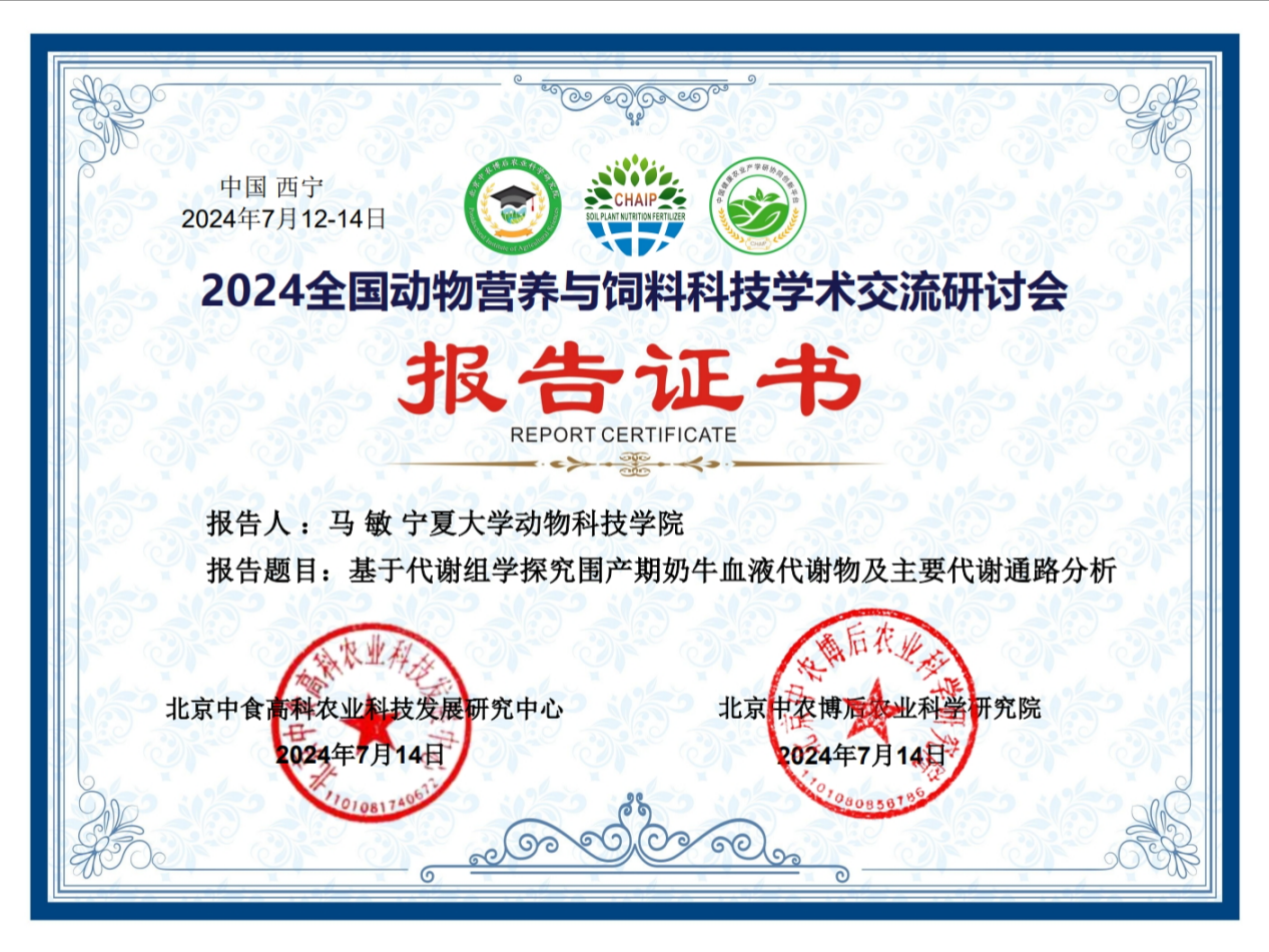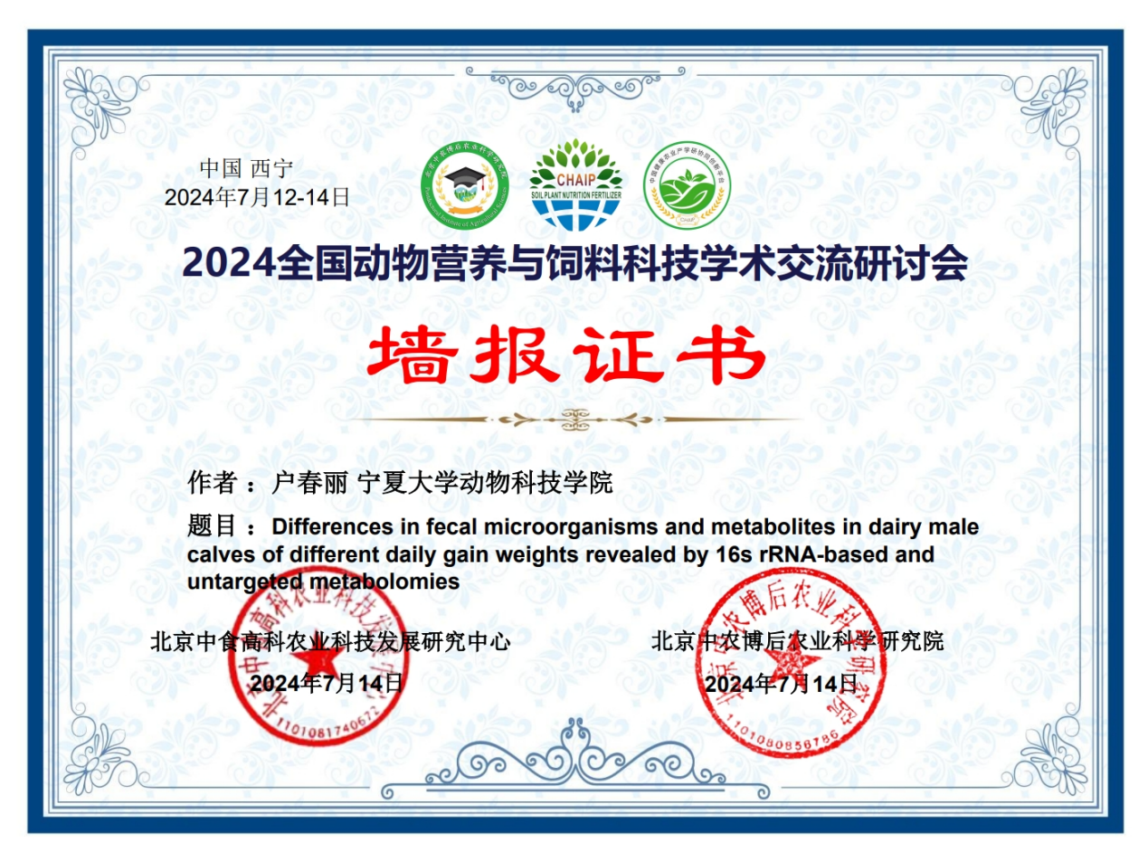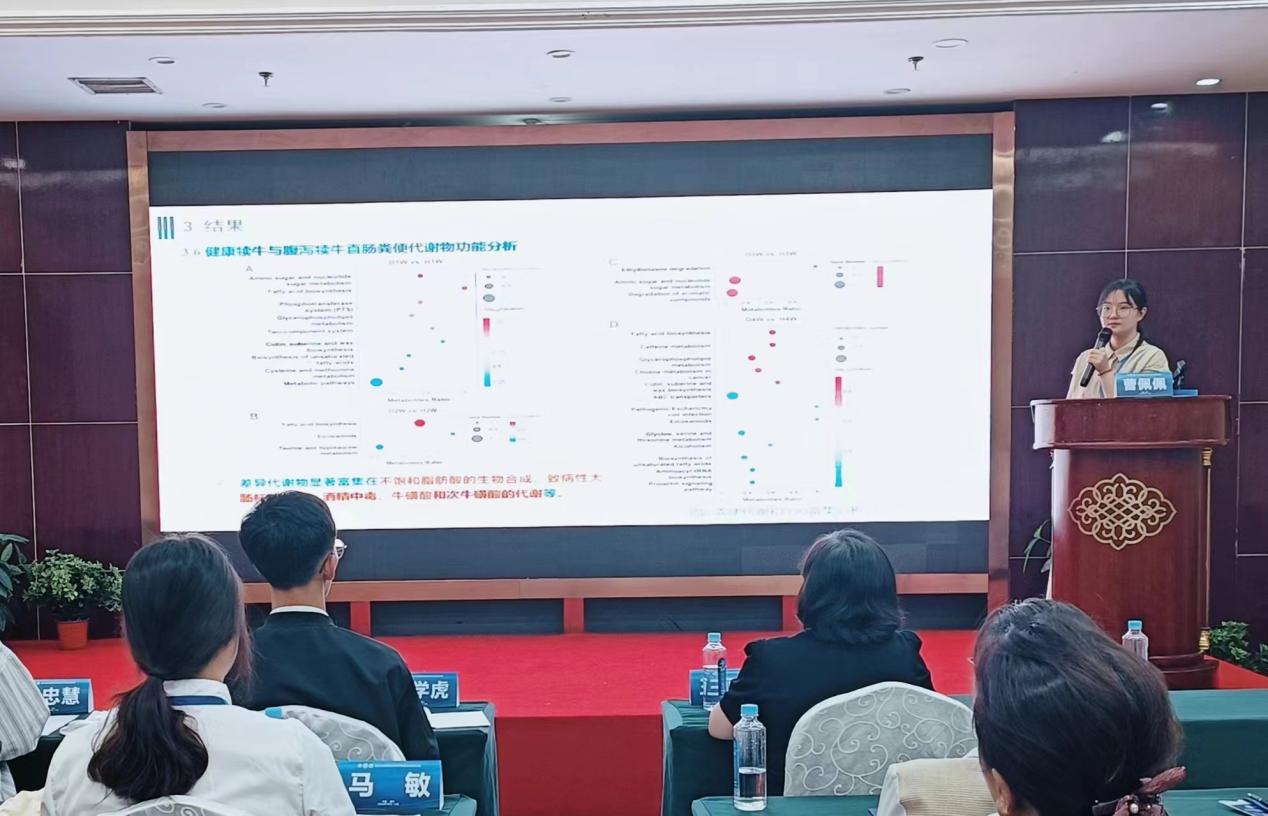 大会通过学术报告和墙报展示等多种形式进行了交流分享。会议有来自西北农林科技大学、东北农业大学、四川农业大学、内蒙古农业大学和懂球体育等多所高校的业界著名专家、企业家、青年才俊和博硕士研究生针对奶牛、肉牛、家禽、猪、羊等动物的肠道健康、营养调控、肉质评定等方面进行了汇报交流。公司马燕芬研究员指导的博士研究生马学虎以《EGCG缓解氧化损伤奶牛乳腺上皮细胞的研究》为题作口头报告、硕士研究生曹佩佩以《基于16s rDNA和代谢组学揭示调控犊牛腹泻的关键微生物和关键代谢物》为题作口头报告、硕士研究生宋忠慧以《高低日增重奶公犊血浆差异代谢物分析研究》为题作口头报告、硕士研究生马敏以《基于代谢组学探究围产期奶牛血液代谢物及主要代谢通路分析》为题作口头报告、博士研究生户春丽以《Differences in fecal microorganisms and metabolites in dairy male calves of different daily gain weights revealed by 16s rRNA-based and untargeted metabolomies》为题作墙报展示。通过参加本次学术讨论会,不仅加强了团队师生的学习交流能力,又对当前我国动物营养与饲料科学领域热点有了更为深入的了解。为公司与国内知名学者提供了一个交流平台,并为人才培养提供了新的策略,更为团队今后科研方向提供了新的思路。