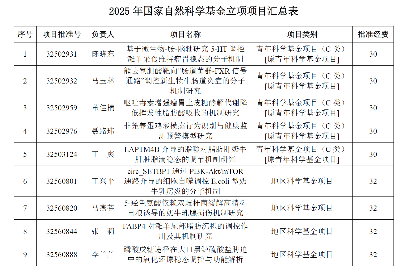 近日,国家自然科学基金委员会正式公布 2025 年度国家自然科学基金集中接收申请项目评审结果。公司在全国基金申报竞争日趋激烈的背景下,凭借深厚的科研积淀、精准的培育举措与强劲的人才实力,再度斩获佳绩 ——共计 9 个项目成功获批资助,其中青年科学基金项目(C 类)5 项、地区科学基金项目 4 项,立项数量稳步提升,科研方向与地方产业需求高度契合,充分彰显了公司在动物科技领域的学科优势与科研竞争力。
