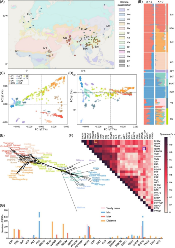 图1牛群体基因组学图谱、环境变量与候选SNP分布