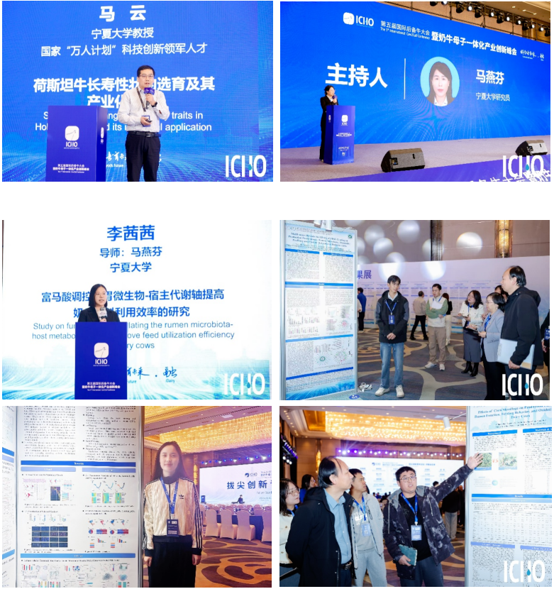 大会围绕“五新”展开特邀报告/前沿论坛、杰出青年科学家论坛、拔尖创新青年论坛等系列活动,全面呈现行业战略突破、科技赋能、模式创新、全球对话与青年力量等核心内容。会上,马云教授作为特邀嘉宾,作《荷斯坦牛长寿性状的选育与应用》主题报告,系统分享了公司在奶牛育种领域的研究成果;马燕芬研究员担任会议报告主持人及拔尖创新青年论坛评委,助力青年学术交流。其指导的博士研究生李茜茜,在拔尖创新青年论坛作《富马酸调控瘤胃微生物-宿主代谢轴提高奶牛饲料利用效率的研究》口头汇报;马学虎、王川川、沙志行等研究生以墙报形式展示研究成果,全面展示公司在奶肉牛领域的最新科研进展。